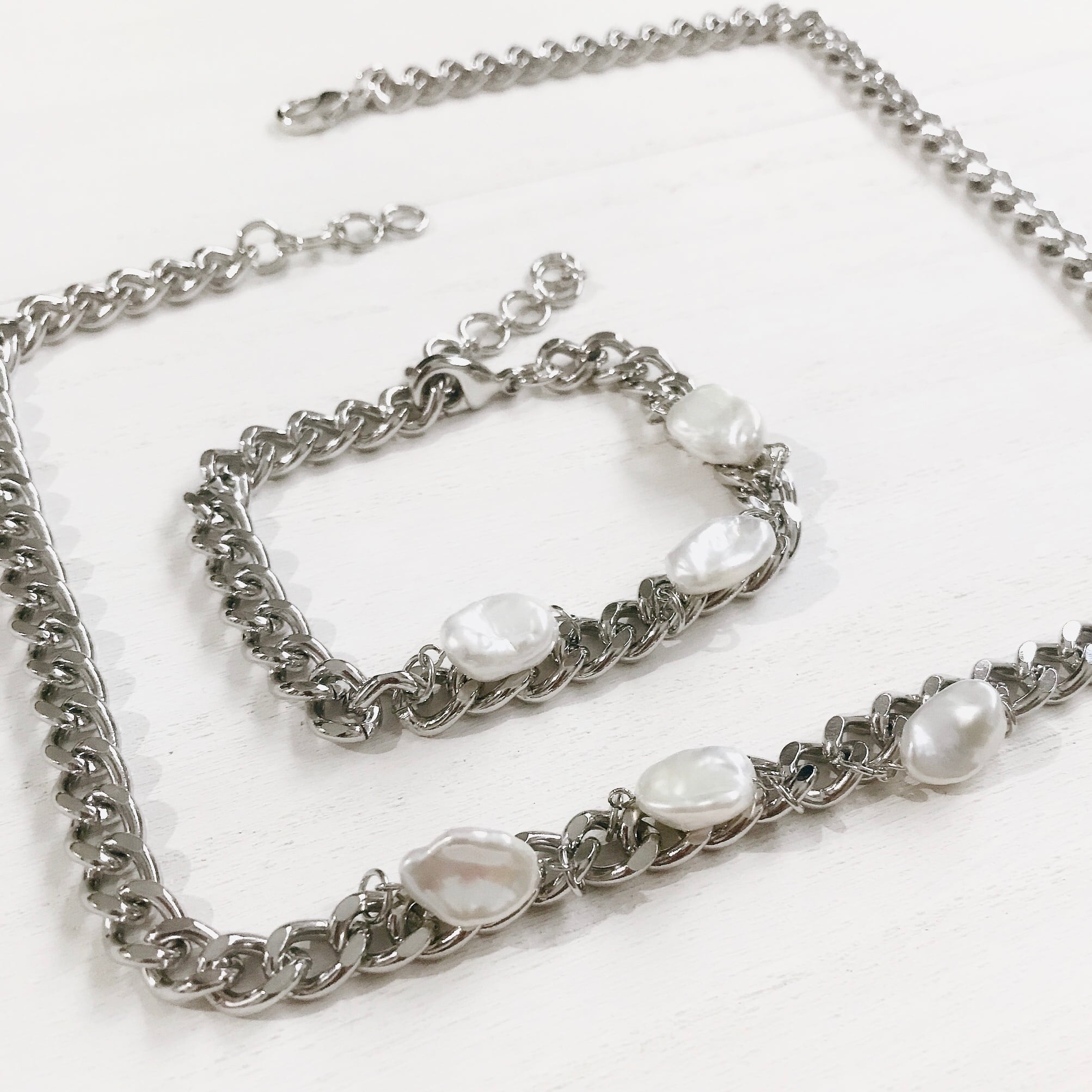 kanameTORi オリジナル商品 (KT-br-409s) どんな方でも、普段のファッションに真珠をさりげなく取り入れることができるパールブレスレット。 重ねつけもしやすく、真珠もポテトタイプなのでカジュアルにつけこなせます。 真珠と喜平チェーンの組み合わせもトレンド感があっておしゃれですよね。 全長 18−20cm 淡水真珠 ポテト 6.5-7.0mm 小判チェーン4.5cm幅 喜平チェーン7.5cm幅 鉄 クリアコーティング