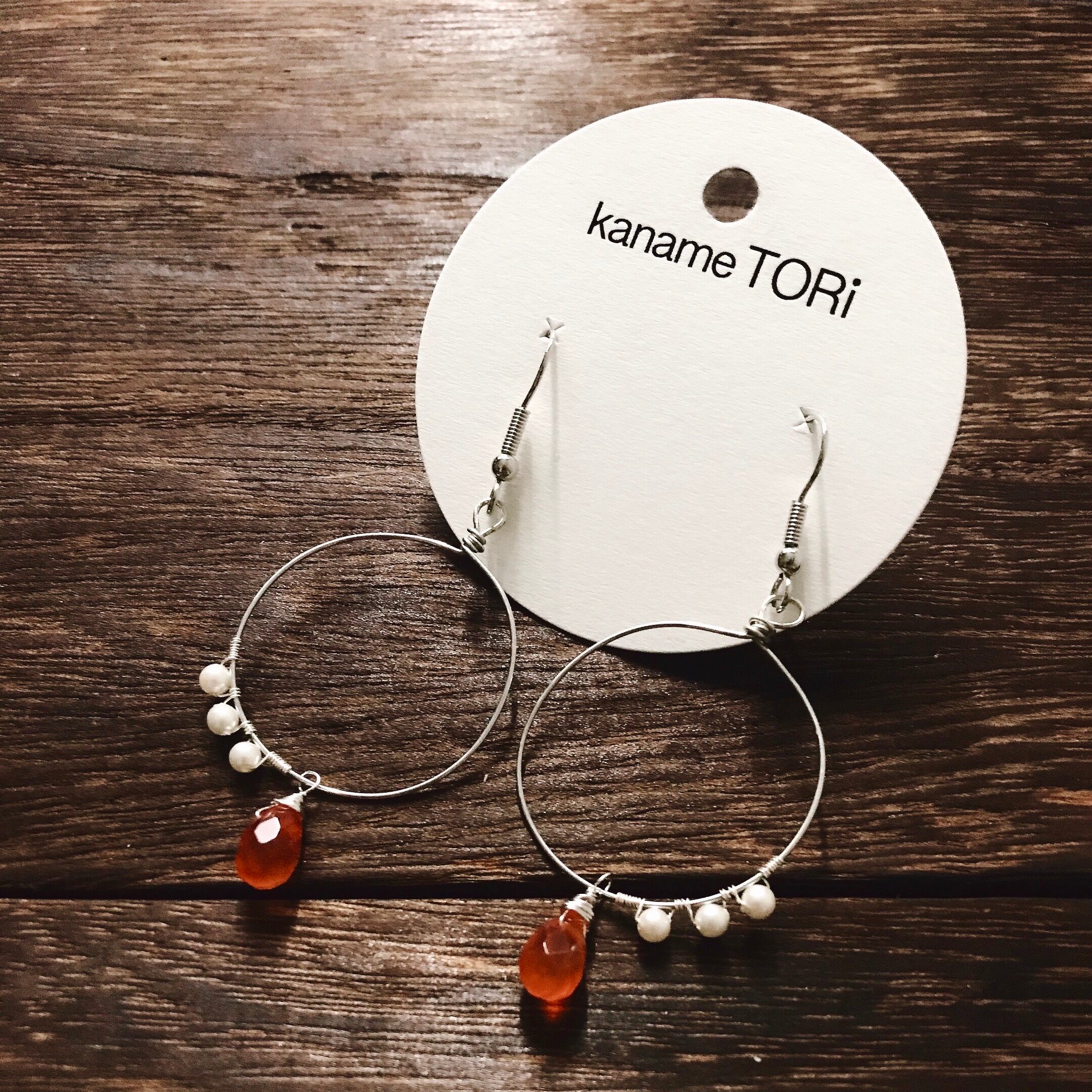 シンプルフープに天然石のカーネリアンとベビーパールを3つずつ付けた