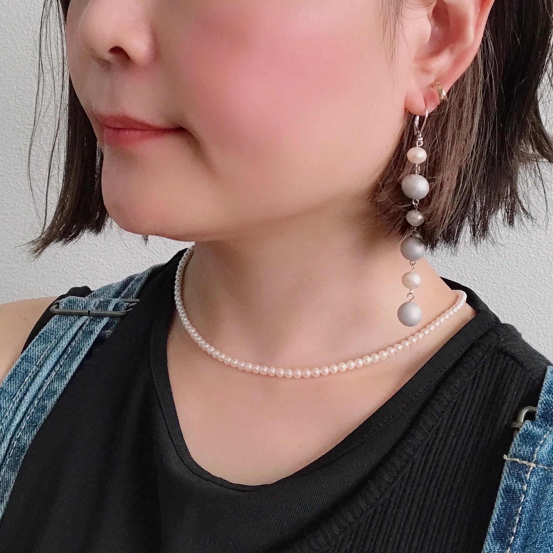 淡水真珠はポテトの形でカジュアルにつけやすく、グレーボールはマットなカラーですが、